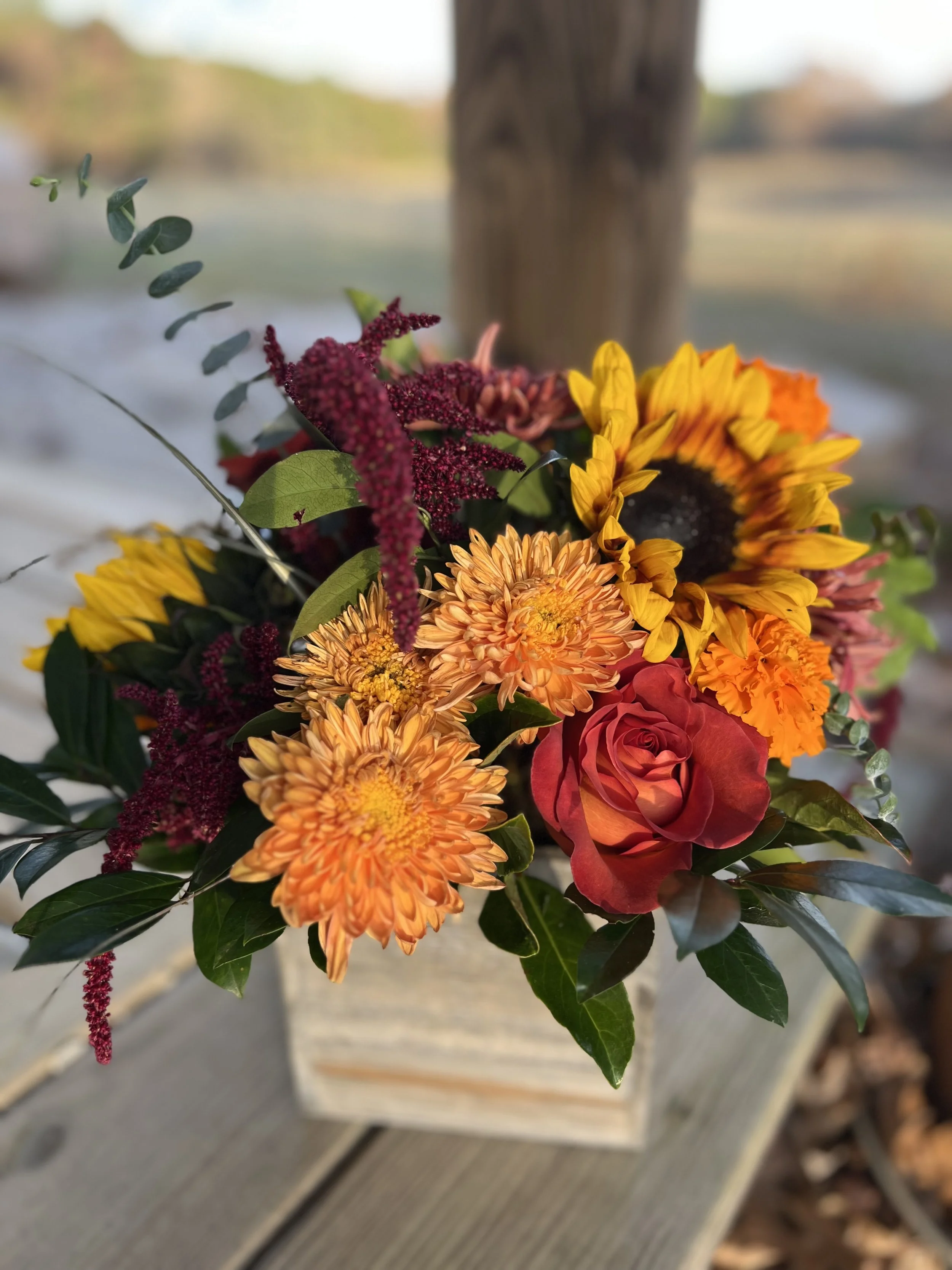 Join us for a relaxed, hands-on evening of creativity and seasonal beauty at Oakland Farm. Together we’ll design a natural Thanksgiving centerpiece in a wooden box overflowing with sunflowers, autumn blooms, and fresh-cut foliage grown and gathered right here in North Carolina.