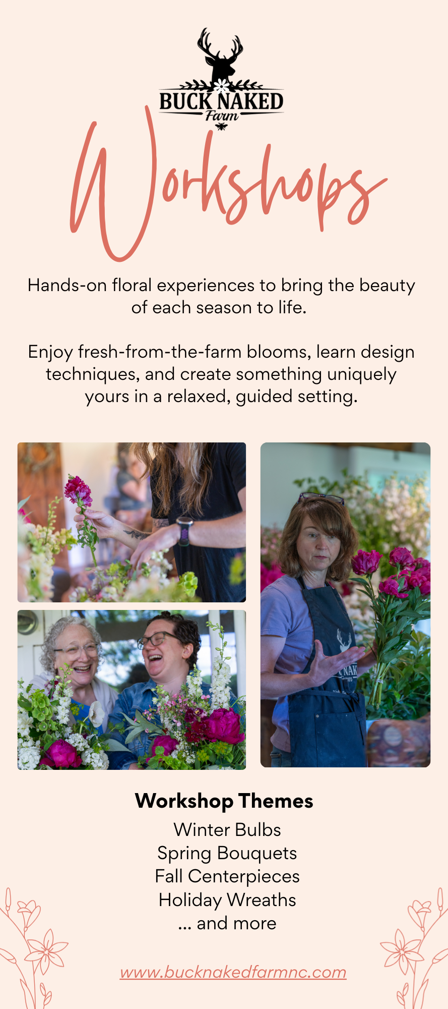 Welcome to the workshop side of Buck Naked Farm. We blend fresh-from-the-farm blooms, thoughtful instruction, and a relaxed setting so you can slow down, play with flowers, and head home with something beautiful you made yourself.