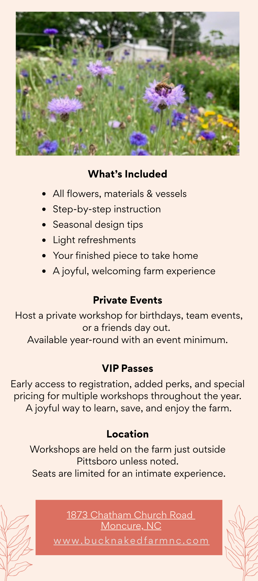 If you have any questions about workshops, private events, or VIP Passes, email us at bucknakedfarmnc@gmail.com — we’re happy to help.